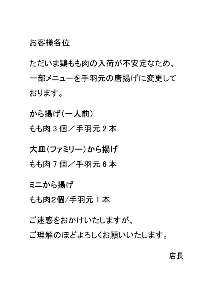 いつもダイムグループをご利用いただきまして誠にありがとうございます。現在、鶏もも肉の入荷が不安定な為、一部店舗(あじへい・一番亭・虹橋食堂・上海四馬路・中華食堂スマロ)でメニューを変更しております。ご理解の程お願い申し上げます。