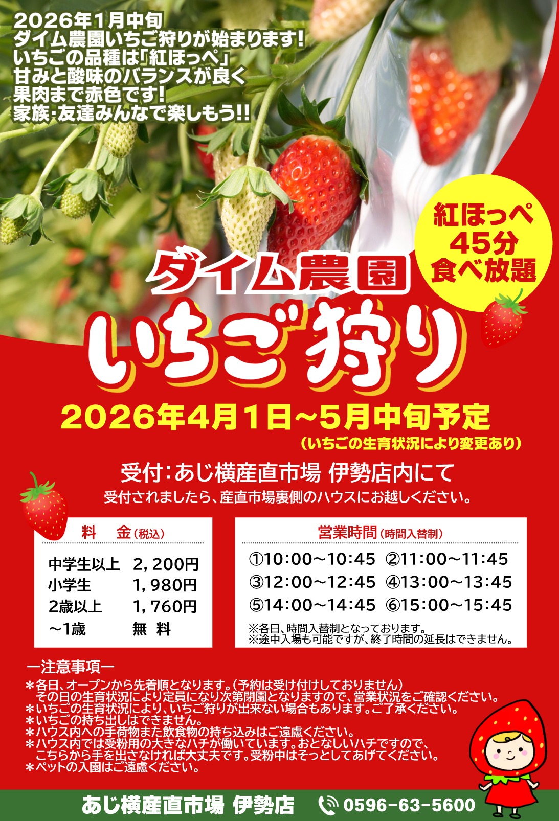 2026年4月1日より「いちご狩り」の価格が変更になりました。ぜひ、ご来園ください。