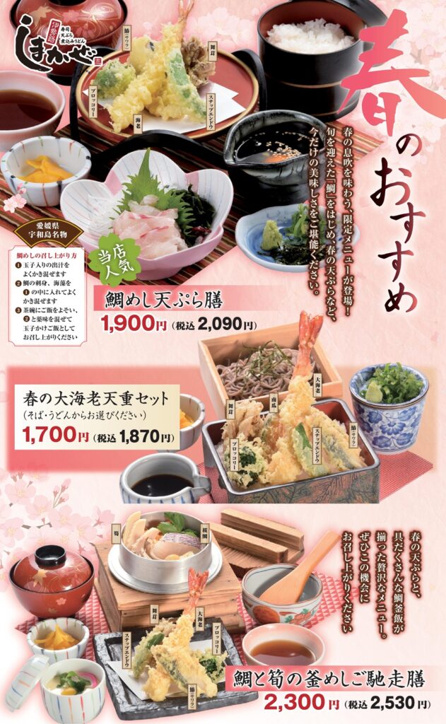 当店人気の鯛めしと春の天ぷら、今だけの美味しさご堪能下さい。